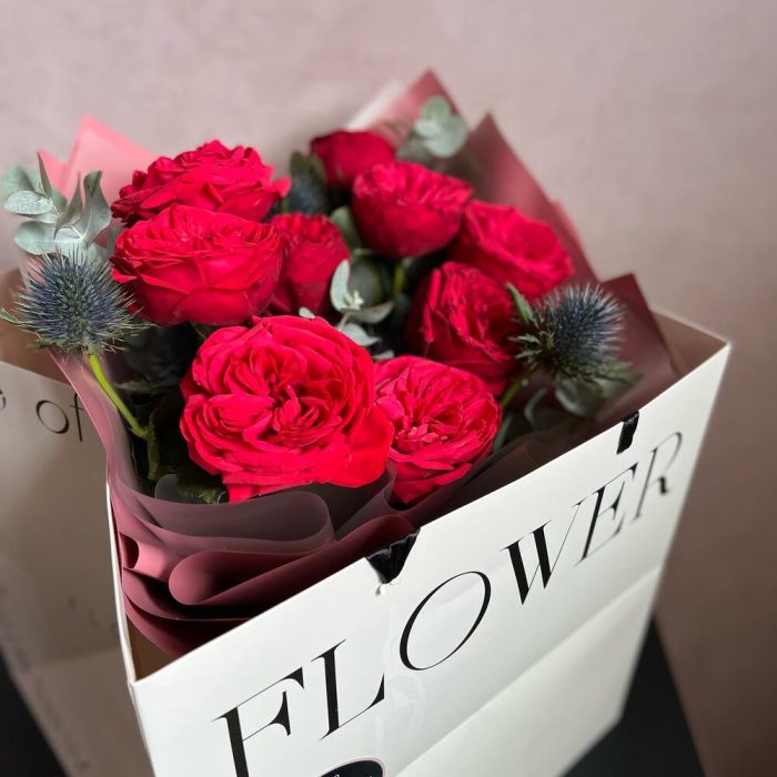 кустовая роза piano – 9 шт.эрингтум – 1 шт.Эвкалипт – 2 шт.декоративная упаковка – 1 шт.Атласная лента – 1 шт.