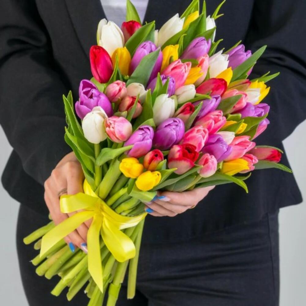 Тюльпан микс – 51 шт.Атласная лента – 1 шт.